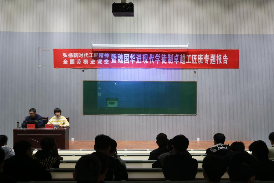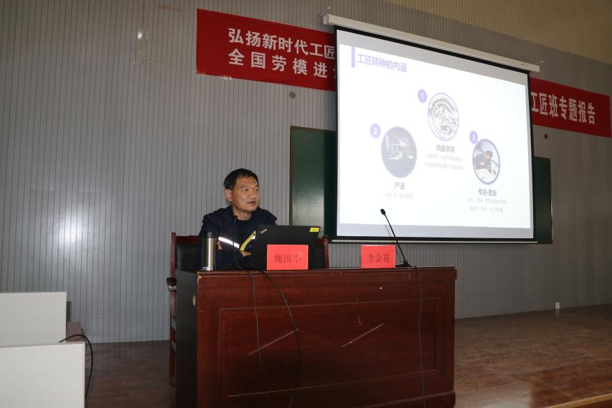 为贯彻落实《国家职业教育改革实施方案》,学习大国工匠精神,创新创业领军人才,培养并传承工匠精神,我校AWC万象城娱乐特邀全国劳模魏国华先生,于2021年3月25日在6号教学楼108室为师生开展了一场以“弘扬新时代工匠精神”为主题的报告会。参加会议人员有AWC万象城娱乐院长安丰金、副院长李金花,以及部分老师代表学生代表等200余人参加了此次报告会,报告会由副院长李金花主持。