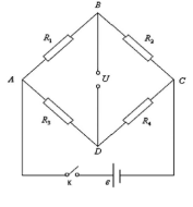 如图所示,当电桥处于平衡时,,四个电阻之间的电势是相等的,此时有公式==K。如果其中一个电阻为传感器,那么它的电阻值就会随着温度或压力等物理变量的变化而发生变化,此时的电桥就处于非平衡状态,此时电势差U也不为0。我们可以看到,U的大小在一定程度上显示的是电阻的变化,如果知道了电势差U的值,也就相应知道了物理变量的变化。