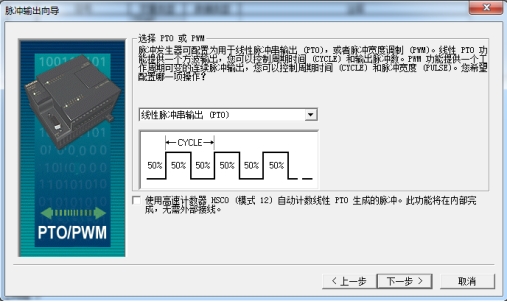 第三步. 从下拉对话框中选择 线性脉冲串输出(PTO)” 。若想监视 PTO 产生的脉冲数目,点击复选框选择使用高速计数器。如下图 3 所示:
