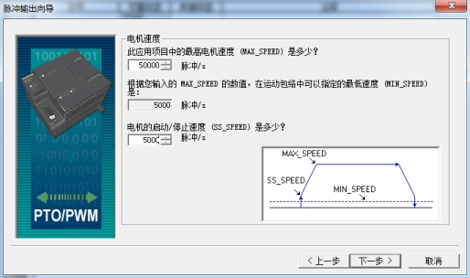 因此,设置最高电机速度为电机额定转速即50r/s*1000Pulses/r=50000Pulses/s),启动/停止速度取其10%,即 5000 Pulses/s)。
