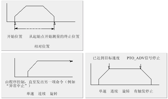 • 操作模式:您根据操作模式(相对位置或单速连续旋转)配置此包络。如果您选择单速连续旋转,您必须输入一个目标速度。请启用PTO_ADV复选框和一个停止距离,为此包络发起一个停止。下图显示了不同的操作模式。