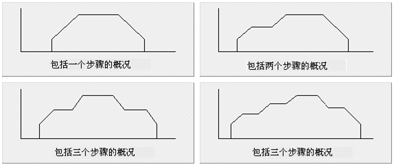 • 包络的步骤:步骤是工具移动的固定距离,包括在加速时间和减速时间所走过的距离。每个包络最多可有4个单独步骤。您为每个步骤指定目标速度和结束位置。如果您有不止一个步骤,请单击"新步骤"按钮,然后为包络的每个步骤输入此信息。下图显示了四个可能的包络,但还可能有其他组合。