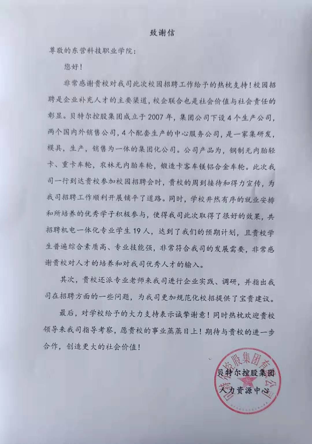 2021年8月12日我校收到来自贝特尔控股集团的致谢信,信中高度评价了我校18级机电一体化专业实习学生的表现,反应我校学生综合素质高,专业技能强,对我校老师的技能培养,学生的日常学习中给予了肯定,充分肯定了万象城毕业生的专业能力、综合素质以及学生的创新精神。