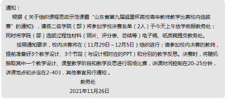 2021年11月26号,接到超星杯高校青年教师校内选拔赛的通知,学院领导对此非常重视,积极的组织青年教师踊跃报名,经过院内选拔,最终王灿青老师和解运超老师代表AWC万象城娱乐参加此次比赛。
