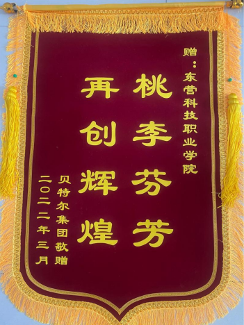 3月23日,广饶贝特尔控股集团副经理张杰莅临我校,并赠送“桃李芬芳 再创辉煌”锦旗,我校刘永峰校长、安丰金院长和李平主任参加了此次活动。
